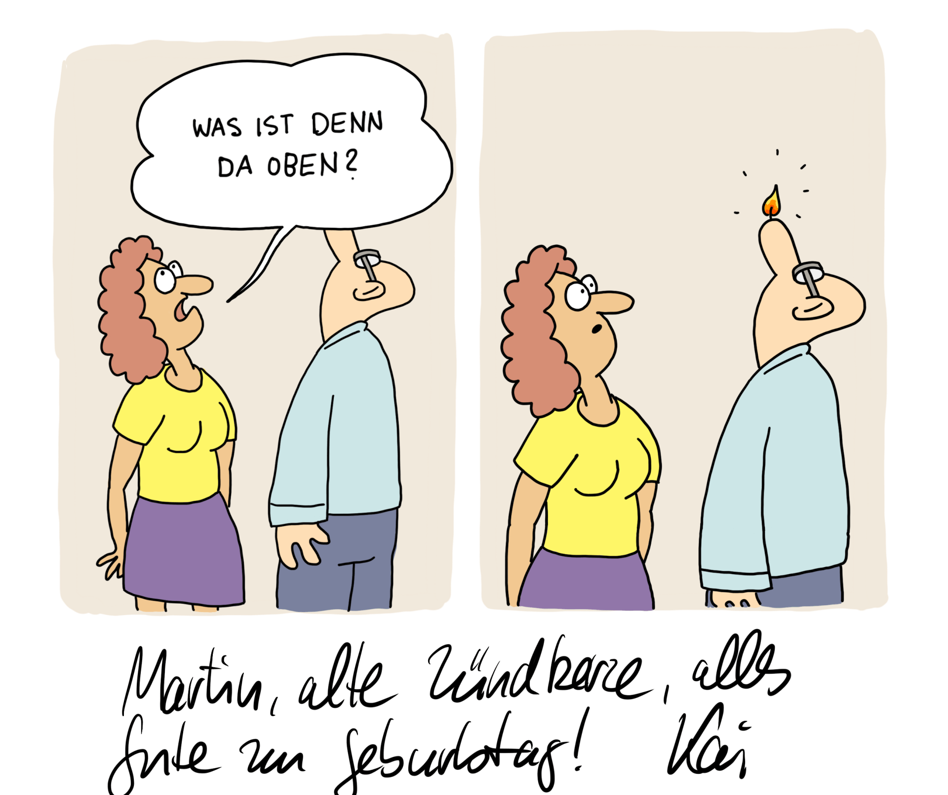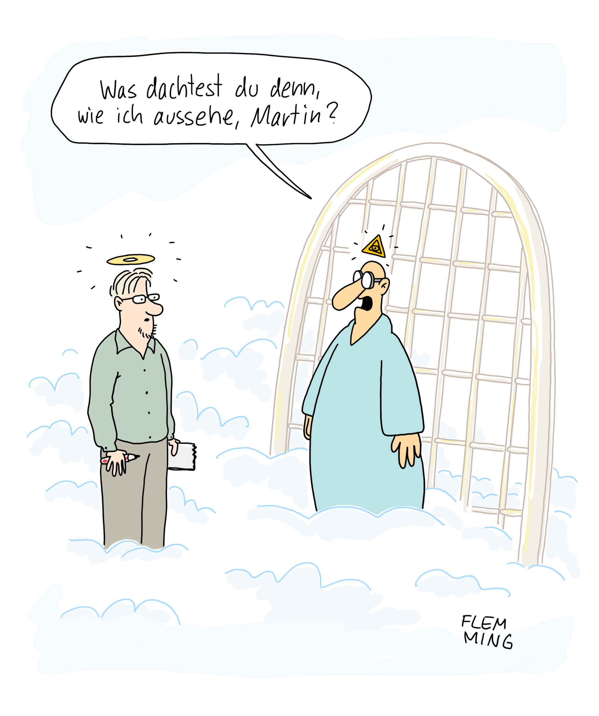 Martin war unglaublich großer Loriot-Fan - nach Loriots Ableben widmete er ihm einen sehr schönen Cartoon, wie dieser im Himmel ankommt, wo alle mit einer Nudel im Gesicht auf ihn warten. Das Original-Aquarell hängt im Haus meiner Eltern, und ich stand oft davor, nachdem an diesem einen, schrecklichen Tag meine Welt aus den Angeln gehoben wurde. Ich dachte mir, eine Hommage wäre eine schöne Idee. Zwar war Martin zutiefst überzeugter Atheist und glaubte genauso wenig an ein Dasein nach dem Ableben wie ich selbst - aber hätte es irgendwo ein Wiedersehen gegeben, dann hätte bestimmt Loriot auf ihn gewartet und ihm einen gebührenden Empfang bereitet, zusammen mit Martins liebem Vater, welcher 2019 verstarb.